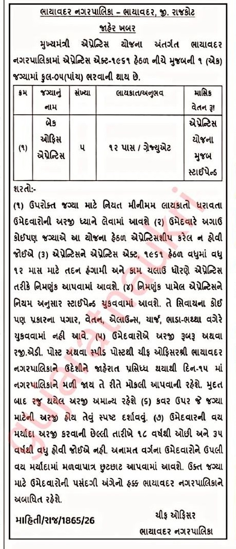 Bhayavadar Nagarpalika Apprentice Recruitment 2026: notification released for 05 Apprentice posts under Mukhyamantri Apprenticeship Yojana. Check eligibility, age limit, stipend, selection process, important dates and how to apply.